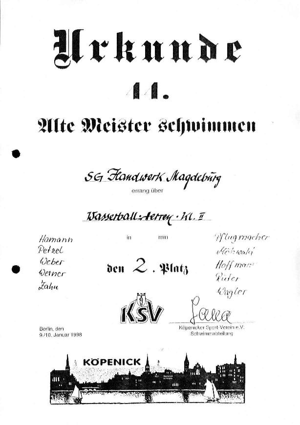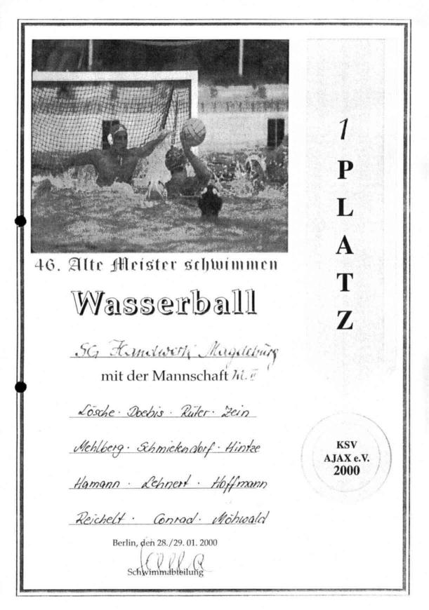 Berlins. Im Jahre 2000 zeigte sich, dass die Magdeburger Spielgemeinschaft Handwerk und SCM die meisten Meister vorwies und diese auch die beste Form zeigen konnte. Magdeburg stellte sich in den Altersklassen über 50 Jahre und 40 - 50Jahre. Die über 50-Jährigen blieben ohne Niederlage. Ohne größere Probleme wurden die Mannschaften aus Berlin mit 7 : 4 , Lips Leipzig 11: 2 und Gotha mit 3 : 1 im Finale besiegt. Da wurden schnelle Konter geschwommen und der Gegner mit Kombinationen überrascht, die selbst ihm Beifall abverlangten . Dies erinnerte an Zeiten, da Dynamo Magdeburg und die Mannschaft des SCM die Ausnahmestellung des Magdeburger Wasserballes national und international untermauerten. Viele dieser Spieler hatten schon in einer ausverkauften ( !) Elbehalle im Europacup der Landesmeister gespielt. Diese Mannschaft ist es auch, die sich in letzter Zeit intensiv auf die Mannschaftsweltmeisterschaft August 2000 vorbereitet. SG Handwerk: |